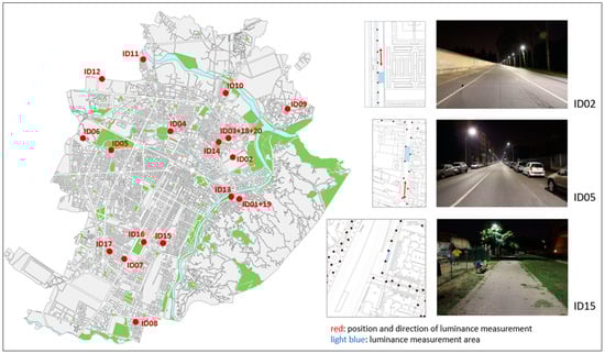 On the left: plan view of the city of Turin (Italy) with indication of the locations of the area considered in the sample (ID 01 to ID 20). On the right: examples of the areas considered with indication of the individual lighting fixtures: ID 02—motorized traffic road; ID 05—motorized traffic road; ID 15—pedestrian area.