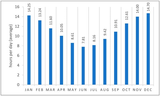 Considering the control system of the lighting installations, both the ex-ante and ex-post lighting systems were switched on and off through a centralized remote-control system (switch-on threshold equal to 30 lx and astronomical clock reserve). The ex-ante lighting system was kept at full power throughout the whole night, while for the ex-post installation, a control system was adopted to dim the light in two stages during the night-time: from 12:00 a.m. to 01:00 a.m., the power is reduced by 10% (90% of nominal luminous flux), and from 01:00 a.m. to 06:00 a.m., the power is reduced by 30% (70% of nominal luminous flux). The average switch-on hours of the ex-post installation (4113 h average per year) spread throughout the 12 months are reported in Figure 2.