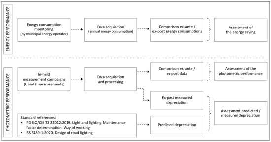 Considering the case study described above, a method was defined to assess and compare the photometric and energy performances of the ex-ante and ex-post installations and to monitor the performances of the ex-post systems over a period of approximately 5 years. The method was based on the acquisition of data through in-situ measurement campaigns and on the further elaboration of the same. In particular, the adopted method included different phases: (i) assessment of the energy performance (ex-ante and ex-post systems); (ii) assessment of the photometric performance (ex-ante and ex-post systems); and (iii) assessment of the depreciation of the photometric performance (ex-post system). A flowchart illustrating the methodological approach is reported in Figure 3, and further details about the method phases are reported in the following subsections.
