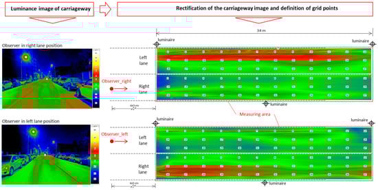 Luminance measurements of the road surface were conducted for motorized traffic roads, while horizontal illuminance was measured for pedestrian and cycle areas. The installations were assessed at full power to verify compliance with standard requirements, considering the lighting class defined in the design phase [45]. For the luminance acquisition in motorized traffic roads, a TechnoTeam “LMK Mobile” ILMD (Image Luminance Measuring Device) (based on a Canon EOS digital camera) with a measurement uncertainty of 4.7% was used to assess the luminance distribution of the framed carriageway, represented as a luminance image. In this study, the static measurement method was adopted as described by EN 13201-4 [44] and CIE TR 194 [46]. The luminance image was captured with the observer positioned in the center of each traffic lane, 60 m away from the measuring area of the carriageway. The analysis of the luminance images followed a three-step process, as shown in Figure 4 and described as follows: