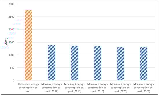 Results showed that the percentage reduction between the annual energy consumption ex-ante (2761 MWh) and the measured annual energy consumption ex-post (1341 MWh, calculated as the average between data from 2017 to 2021) is equal to 51%. Moreover, results demonstrated that the annual energy consumption during the ex-post monitoring period (2017–2021) was fairly constant.