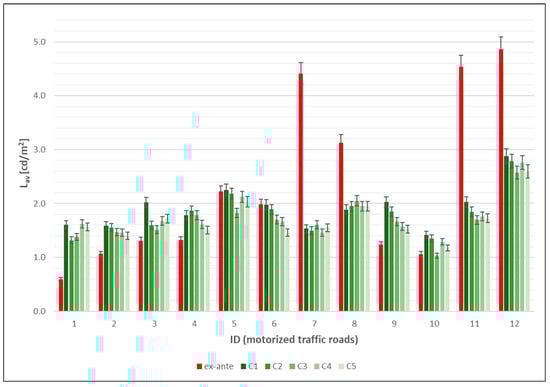 The lighting performances of both ex-ante and ex-post installations were evaluated by means of the in-situ photometric measurements. In Figure 6, the luminance data measured in the motorized traffic roads are reported. Likewise, Figure 7 shows the illuminance data measured in the pedestrian areas. The measurement uncertainties of the instruments used in the measurement campaign are reported through error bars.