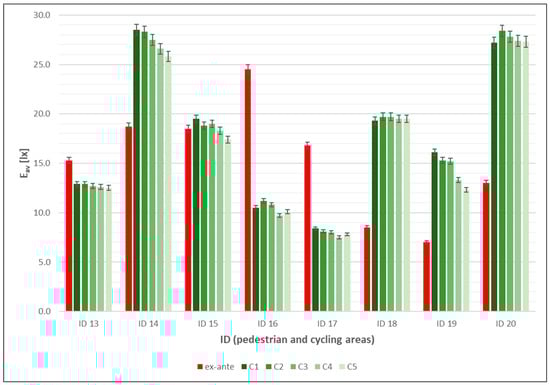 Illuminance values measured on the pedestrian and cycling areas (ID 13 to 20) during the ex-ante and ex-post (C1–C5) measurement campaigns. Error bars report the measurement uncertainty of the luxmeter. The standard requirements of the UNI EN 13201-2 are reported as dotted lines.