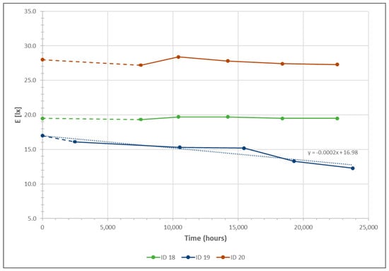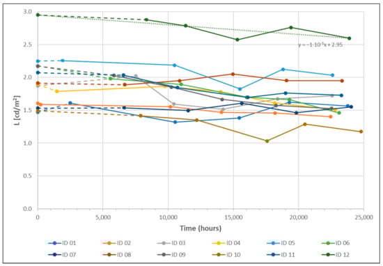 To compare actual and estimated depreciation trends, the overall lighting installation sample was divided into three subsets: (i) motorized and traffic roads with luminaires equipped with LED01, (ii) pedestrian areas (park areas) with luminaires equipped with LED02, and (iii) pedestrian areas (footpaths and cycling area) with luminaires equipped with LED01. The analysis was conducted separately for the three subsets since the measured photometric quantities and the characteristics of the LEDs, in terms of lumen maintenance, were different. For each subset, a regression analysis was applied to derive an overall measured depreciation trend to be compared to the estimated one.