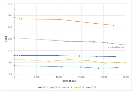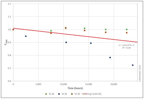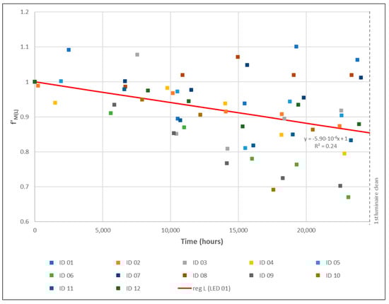 The depreciation of the light output over time is defined as the ratio of the illuminance produced by the lighting system after a certain period to the illuminance produced by the system when new and is expressed by the maintenance factor (Equation (1)). Therefore, the maintenance factor trend reflects the light loss (or depreciation of the light output) of a given installation over time.
