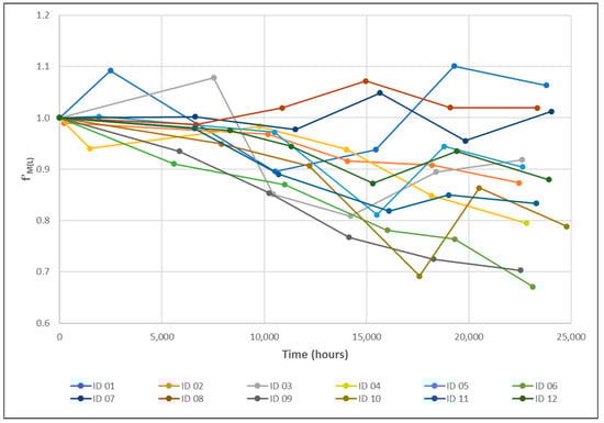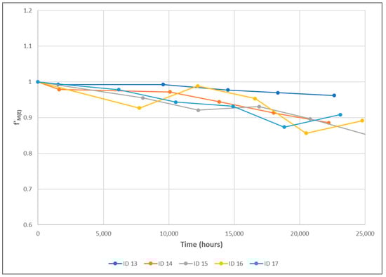 In this study, the depreciation of the light output of the considered sample installations was assessed using the data measured to assess the lighting performances of the installations, that is: (i) the road luminance for motorized traffic roads and (ii) the horizontal illuminance on the pavement for pedestrian areas. The maintenance factor f′M was therefore calculated as the ratio of luminance (or illuminance) referred to the lighting system at a given time (C1–C5) to the luminance (or illuminance) when the system was new (C0), as reported in the Equation (2).