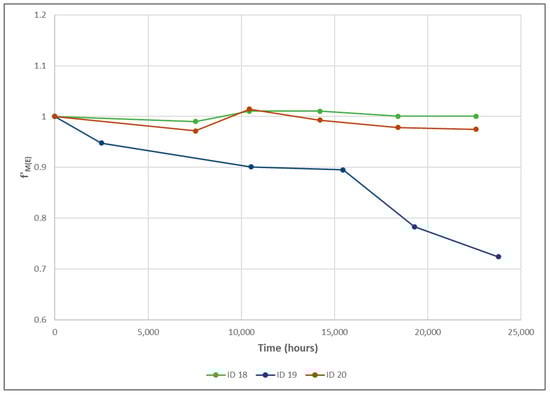 Data from the ex-post LED installations acquired during the five measurement campaigns were further investigated in order to assess the depreciation of the photometric performances over the monitoring period. As described in Section 3.3. the maintenance factor trends obtained from data measured in the field (f′M(L) and f′M(E)) were compared with the predicted maintenance factor trends (fM) calculated based on methods defined in the standards and the literature.