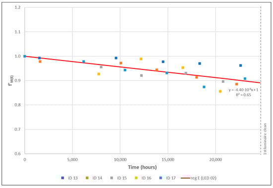 Finally, the predicted depreciation trends were compared with the measured depreciation. Figure 19, Figure 20 and Figure 21 show the comparison between predicted maintenance factor trends (fM) and the linear regressions assumed as representative of the maintenance factor trends obtained from data measured in the field (f′M) for the three subsets: (i) luminance data, luminaires with LED01 (f′M(L)); (ii) illuminance data with LED02 (f′M(E)); and (iii) illuminance data with LED01 (f′M(E)).
