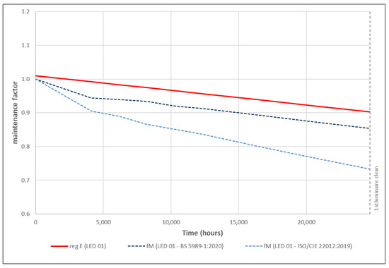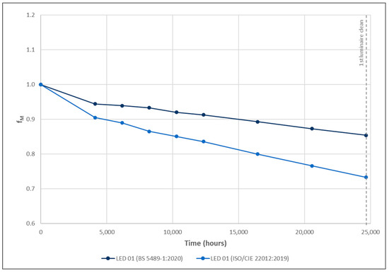 The predicted depreciation of the same lighting systems was calculated assuming the standard maintenance factor calculation method. In particular, the PD ISO/CIE TS 22012:2019 [37] was assumed as a reference for the maintenance factor determination method, since it is currently considered as the latest best practice guidance. As reported in [37], the predicted maintenance factor (fM), is determined using the formula: