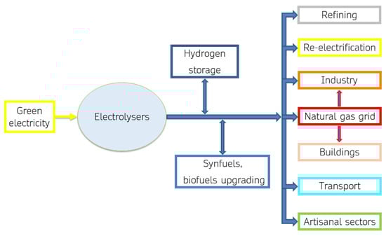 Hydrogen has the highest mass heating value among fuels, and an invaluable decarbonization potential [14] since its combustion generates no carbon dioxide emissions. Green hydrogen can also be used as a renewable energy storage system, linked to the electrification of the processes maximizing the use of green energy from RES. Industrial activities already using hydrogen as a feedstock or/and process agent are favored for electrolytic H2 integration in their productive processes, because security and safety protocols about hydrogen use are known and managed. Furthermore, gradual decarbonization of the natural gas (ng) infrastructure could take place by injection of increasing percentages of green hydrogen or synthetic methane in the transmission natural gas grid; experimentation with up to 10% in volume of hydrogen are ongoing.