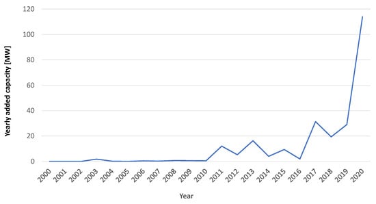 Growth scenarios in the energy sector are notoriously unpredictable, often influenced by nonlinear trends or sudden technological advancements. Nonetheless, hydrogen’s impact on energy systems is expected to significantly contribute to the energy transition [1,3]. We can say that in 2022, global hydrogen production grew by 2–3% to reach 95 Mtonnes, but low-emission H2 was about 0.7% (less than 1 Mtonne) of the global production, almost all from fossil fuels. The rate of growth of hydrogen production in the last three years is not particularly remarkable, if according to the data diffused in [1], the production in 2020 was of about 6 Mtonnes (from 89 Mtonnes in 2020 to 95 Mtonnes in 2022), with a rate of growth of less than 7%. Only a small part of the generated hydrogen is produced through electrolysis. In fact, the installed capacity of electrolyzers is currently quite limited. Globally, as depicted in Figure 2 and Figure 3, compiled by the authors based on data provided by the IEA in [4], the installation of electrolyzers, which began in the early 2000s, has never really taken off and a meaningful increase in power installed can only be observed after 2020.