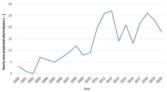 Numbers of electrolyzers yearly projected in the period 2000–2020.