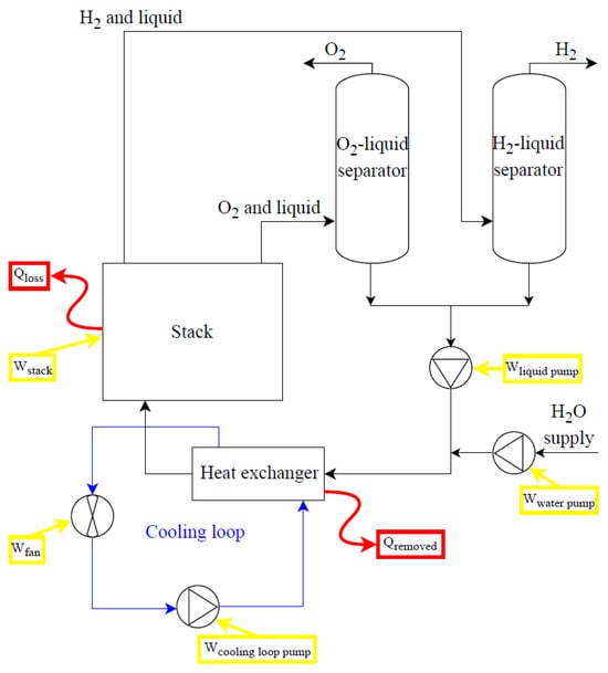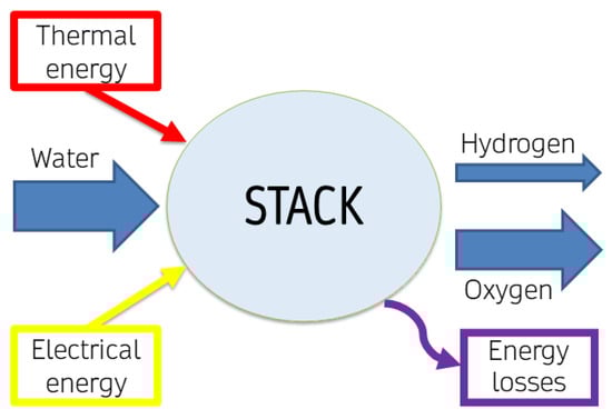 Additional losses at the stack level should be taken into account. Considering an electrolytic stack, a mass balance can be written as in Equations (2) and (3), in mol, or Equation (4), in mass: