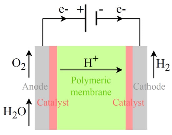 In a PEM electrolysis cell (Figure 6), a polymeric membrane acts as the electrolyte and separator, allowing for only proton ion (H+) transport from the anode to the cathode. Platinum group metals (usually iridium and platinum) are used as catalysts to accelerate the splitting process. Scarce materials can represent a barrier to electrolyzers’ scaling up. PEM water electrolysis is comprehensively highlighted and discussed in several reviews available in the literature, such as [18,19].