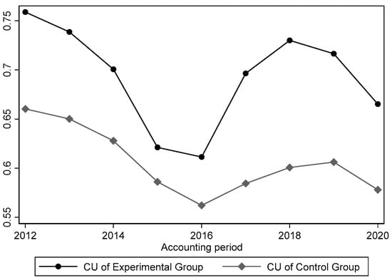 where denotes enterprises, and denotes time; is the core explained variable and represents the enterprise’s capacity utilization rate; is the grouped dummy variable that takes the value of 1 for polluting enterprises and 0 for nonpolluting enterprises; is the time dummy variable, which is assigned a value of 1 for 2016 onward (excluding 2016) and 0 otherwise; is the DID variable, which is the product of and , and represents the control variables. represents the individual fixed effects; denotes the time fixed effects, and denotes the stochastic disturbance term.