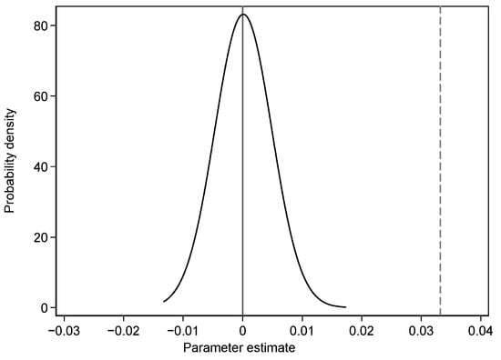 As there are many factors affecting enterprises’ capacity utilization rate, the results of the baseline regression might be due to unobservable factors. To eliminate the above concerns, we conducted a placebo test using the following steps. First, all sample enterprises are randomly assigned to experimental and control groups, and the relative proportions of the generated experimental and control groups remain unchanged. Subsequently, the product term of the newly grouped dummy variable and time dummy variable is constructed (). Finally, in the model (1) is replaced by , and the estimation proceeds. The process is repeated 500 times to obtain 500 estimated coefficients for . The distribution of all estimated coefficients is plotted in Figure 2, which shows that the mean of the estimated coefficients is close to 0, and these coefficients follow a normal distribution. The estimated coefficient of the DID variable in column 2 of Table 2 is 0.0332, which is far from the distribution. The results of the baseline regression are robust and not due to unobservable factors.
