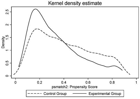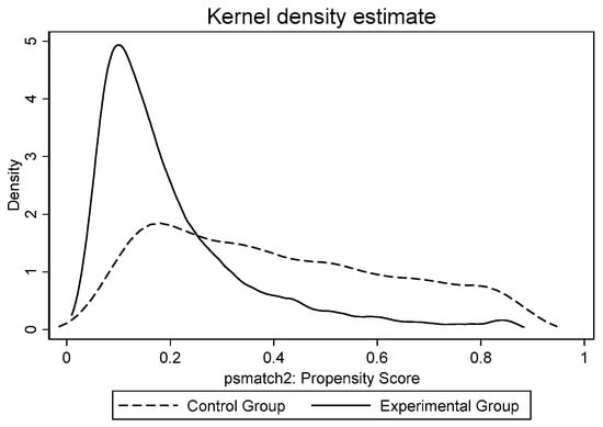 To address endogeneity issues induced by sample selection bias, we further used propensity score matching (PSM) to process samples. The control group with the most similar characteristics to the experimental group was selected using a 1:1 caliper nearest neighbor matching method. After PSM, the differences between the two groups were significantly reduced. Figure 3 and Figure 4 show the kernel density distributions of the experimental and control groups before and after PSM. A significant difference in the kernel density distribution existed between the two groups before matching, which decreased significantly after matching.