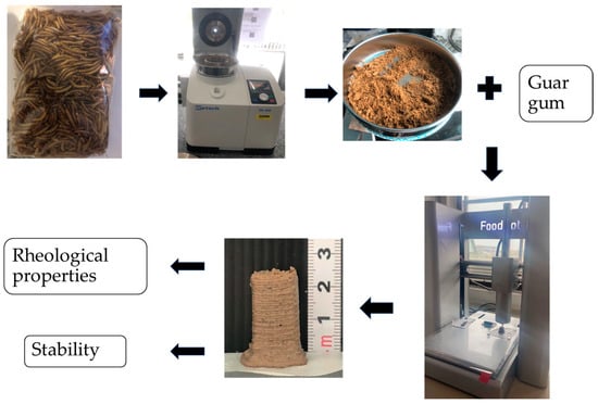 The dried powdered mealworm was mixed with hot water at a ratio of 1:1 w/w and then blended in a blender (HR2221/00, PHILIPS, Eindhoven, The Netherlands). A hand homogenizer was used for subsequent blending until the sample was well mixed into an MP. The MP was then mixed with guar gum at concentrations of 0, 1, 1.25, 1.5, and 1.75% w/w and labeled as MP 0, MP 1, MP 1.25, MP 1.5, and MP 1.75, respectively. The samples were kept at 4 °C overnight before printing, as shown in Figure 1. All samples were prepared with 3 replicates for each experiment.