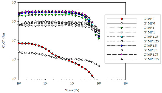 The yield stress was obtained by applying an oscillatory shear stress with a frequency of 1 Hz, and increasing from 1 to 1500 Pa at a temperature of 25 °C. The cross-over point between G′ and G″ was taken as the yield stress of the MP [30].