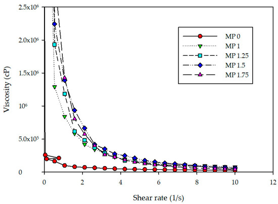 A shear thinning behavior is important to printability. The printing material should have a viscosity that is sufficiently low to allow the material to flow through the nozzle tip at a high shear rate. Still, the material has to recover its viscosity during the deposition stage to support the structure [40]. Figure 3 shows that all the MP samples in the present study exhibited a non-Newtonian shear thinning behavior, with guar gum supplementation strengthening this behavior. An MP is thus extruded more easily from the nozzle tip by adding guar gum to the formulation. At the same shear rate, an increase in the concentration of guar gum increased the viscosity of the MP. Owing to the increased hydrogen bonding activity of the guar gum due to the hydroxyl group of the guar gum molecule [41], a small amount of guar gum notably affects the electrokinetic properties of the system [42].