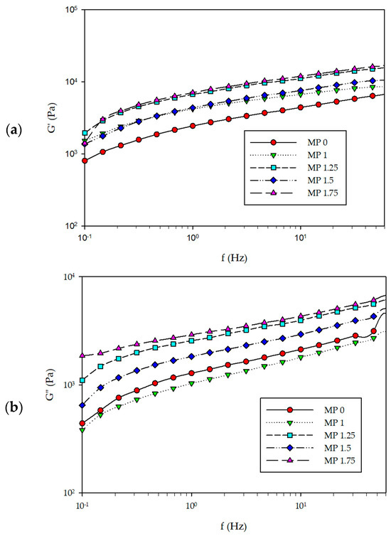The proximate analysis (Table 1) showed that the MPs had a high protein content. The strength of the gel may therefore be due to the interaction between the galactomannan of the guar gum and protein, strengthening the network structure of the system [44]. The frequency sweep results indicate that G′ increased with the concentration of guar gum, possibly owing to the network structure of galactomannan and protein and hydrogen bonds. Lei et al. [45] studied the effect of guar gum on the linear rheological properties of phycocyanin and found that samples containing guar gum had higher G′ and G″ values. Still, as the concentration increased, G′ and G″ decreased owing to the increased entanglement of galactomannan chains, which prevented interaction with proteins. This result is consistent with the results of the present study in that MP 1.5 had a low value of G′, which may be due to less interaction between galactomannan and protein, whereas MP 1.75 had a high value of G′, presumably because of greater hydrogen bonding.