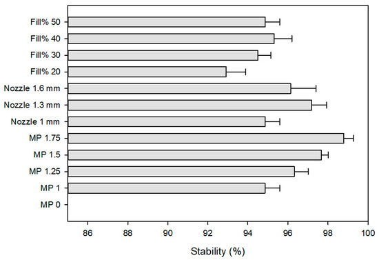 Stability of MP 0, MP 1, MP 1.25, MP 1.5, and MP 1.75 and the effects of the nozzle size (1, 1.3, and 1.6 mm) and infill percentage (20%, 30%, 40%, and 50%) on stability. The samples are summarized in Table 2.