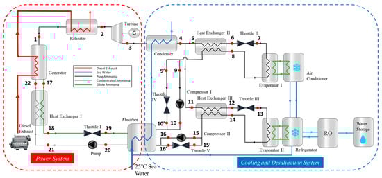 To address the aforementioned issues, this paper introduces seawater desalination technology [21,22,23] into the combined power and refrigeration cycle, proposing a novel marine diesel exhaust heat-driven ammonia–water absorption cooling-power-desalination combined cycle (CPDCC). Firstly, to address fluctuations in refrigeration demand, this paper introduces a novel approach: utilizing excess cooling capacity for seawater icing to fulfill the ship’s cooling-load requirements and enhancing system stability through seawater desalination. Secondly, in response to varying ship working conditions, this paper analyzes the thermal cycle’s performance under diverse operating scenarios. A single thermal cycle can concurrently generate power, provide refrigeration, support cold storage, facilitate desalination, and deliver other outputs, significantly enhancing the overall utilization efficiency of marine exhaust heat energy. Thirdly, among existing desalination methods, frozen-seawater desalination yields low efficiency but low cost, while RO desalination is efficient but expensive [24,25,26,27]. Consequently, this study integrates the strengths of both methods, utilizing seawater-freezing desalination to significantly lower the feedwater salinity for reverse osmosis desalination, thereby reducing overall seawater desalination costs.