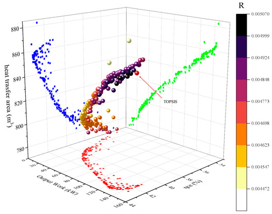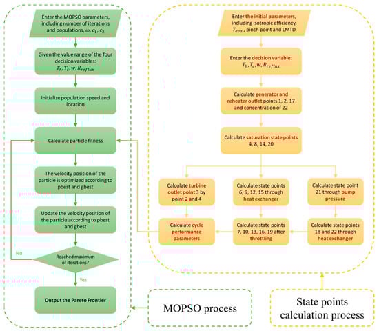 Step 1: Set the initial parameters, including parameters for the cycle system and MOPSO. The circle system parameters consist of the efficiency of circulating components, ambient temperature, temperature difference at the heat exchanger grip point, and cycle calculation equation. The MOPSO parameters encompass population size, velocity upper and lower bounds, inertia factor, global learning coefficient, and individual learning coefficient, which determine the algorithm’s search performance. The iteration from the i-th particle in the t generation to the t + 1 generation is obtained as follows: