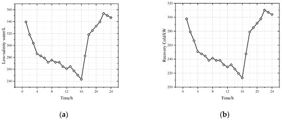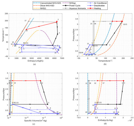 Figure 1 shows a schematic of the cooling-power-desalination combined cycle (CPDCC). In the CPDCC, dilute ammonia–water (22) is fed into the generator and undergoes rectification to produce pure ammonia (1) and concentrated ammonia–water (17). The high-temperature and high-pressure vapor generated as pure ammonia passes through the reheater (2) and drives the rotation of the turbine to perform external work. The exhaust gas from the turbine (3) is directed into the seawater-cooled condenser, where it undergoes condensation to form saturated liquid ammonia (4). The exhaust gas from the turbine (3) is directed into the seawater-cooled condenser, where it undergoes condensation to form saturated liquid ammonia (4). After flow control, the saturated ammonia (4) enters both the air conditioning refrigeration cycle (5) and the cold storage desalination cycle (11). The low-temperature working fluid discharged from the heat exchanger and the evaporator undergoes heat exchange (6, 12) with the condensed ammonia. Subsequently, it is throttled through the throttle valve to the evaporator pressure (7, 13). Upon entering the evaporator, it undergoes the evaporation phase (8, 14) and transforms into saturated ammonia vapor. The heat absorbed during this process can meet the cooling capacity requirements of both the air conditioner and the cold storage. Subsequently, the saturated ammonia vapor is transferred by the heat exchanger (9, 15). The absorber pressure varies due to the different concentrations of ammonia–water. It is either throttled through the throttle valve or boosted to the absorber pressure (10, 16) by the compressor before entering the absorber. The high-temperature concentrated ammonia–water (17), flowing out of the generator, undergoes heat exchange with the low-temperature dilute ammonia–water (21) in heat exchanger I. Following throttling through the throttle valve I to the absorber pressure (19), it enters the absorber, where it combines with pure ammonia to form saturated dilute ammonia–water (20). Subsequently, the saturated dilute ammonia–water (20) is compressed by the working fluid pump (21), and after increasing the temperature (22) through heat exchange it is sent back to the generator for next cycle.