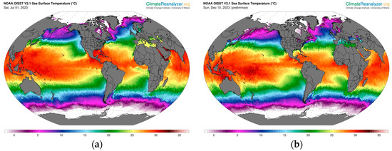 - Climate Reanalyzer. Daily Sea Surface Temperature. Climate Change Institute, University of Maine. n.d. Available online: https://climatereanalyzer.org/ (accessed on 12 December 2023).