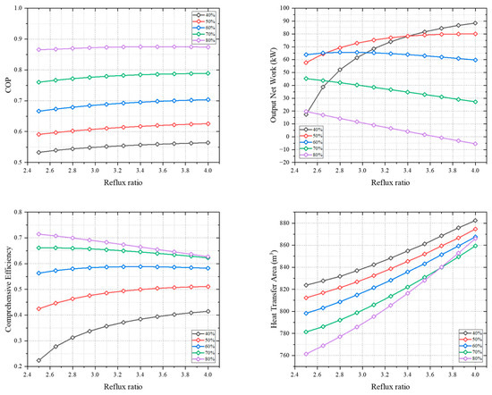 The thermodynamic performance analysis of the cycle’s state points is based on the equations. Within the generator, rectification of the concentrated ammonia–water yields dilute ammonia–water and pure ammonia. The heat absorbed during this process can be calculated as: