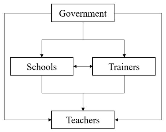 The DCTP is a national program incorporating stakeholders from the government, schools, teachers, and students. The micro level employs a digital empowerment learning framework to guide training and teaching. However, there is uncertainty regarding the implementation, improvement, and top-down feedback of this government-led digital empowerment program at the macro level. Therefore, the first objective of this study is to elucidate the roles and corresponding accountabilities of each stakeholder, as well as to examine how they collaborate and cooperate in this particular project (see Figure 1). To this end, we formulate our first research question (RQ1):