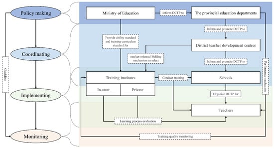 To answer our first research question (RQ1), a relational content analysis was conducted based on the different document data and the coordinator’s perceptions and observations to map out the structure of the implementation mechanism of this national-level government-led DCTP. More specifically, to begin, the first author reviewed all the relevant policy documents and training proposal records to identify a draft socio-ecological system structure that includes different stakeholders that may be involved in the implementation. Second, the first author went through all the relevant documents again in addition to her understanding, experiences, and interpretations of the DCTP implementation as a core role of coordinator, to scrutinize the workflow and operational mechanism based on the draft structure. Third, the first author discussed with the other authors the key processes of the workflow and the role duties of different stakeholders in this implementation. Any controversial labels on these key processes reached a consistent decision.