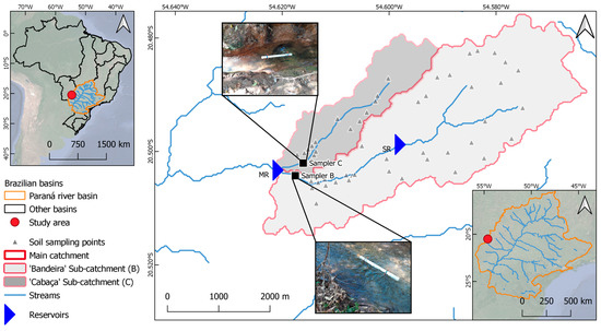 The study was carried out in two urban catchments in the municipality of Campo Grande, MS, the Bandeira (B) Stream catchment and the Cabaça (C) Stream catchment, which have undergone alterations resulting from the urbanization process. The catchment region has a tropical dry and wet climate (Aw, Köppen), with a hot and wet summer and a dry winter [23]. The average annual rainfall and temperature are 1455.3 mm yr−1 and 23.3 °C, respectively [24]. The study area elevation ranges between 529 m and 630 m (a.m.s.l.). The Bandeira (B) stream has a length of 4.6 km, with 0.7 km of canalized bed, and the remaining 3.9 km possessing preserved springs and vegetation on the banks. The Cabaça (C) stream has a length of 2.4 km, 0.8 km of which is completely canalized (working as a stormwater gallery), and its banks are practically devoid of vegetation. The catchments of streams are undergoing a different urbanization process. The Cabaça (C) stream catchment is densely occupied, while the Bandeira (B) stream catchment is in the process of urban densification (Figure 1). Both catchments started their urbanization processes in the 1970s [25].