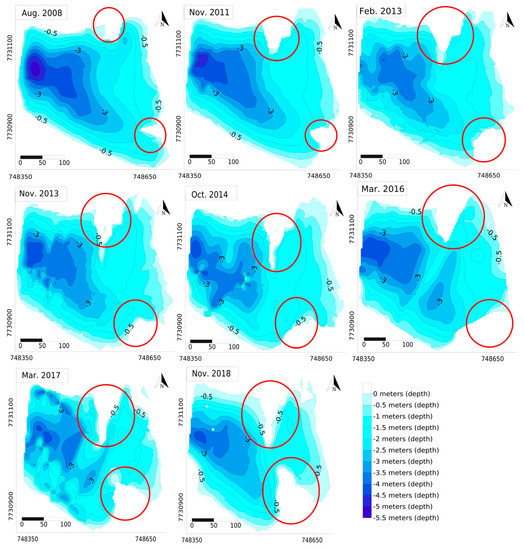 To assess the area and volume of the lake (MR), we monitored the bathymetry in the main reservoir (MR) from 2008 to 2018. In total, eight bathymetric surveys were performed. The first bathymetry took place in 2008 using a depth gauge. The other bathymetries that took place in November 2011, February and November 2013, October 2014, March 2016, March 2017, and November 2018 were performed using an acoustic profiler, (SonTek RiverSurveyor M9, SonTek, San Diego, CA, USA) and a boat as a platform to navigate and obtain the data. The bathymetric survey performed in 2008 was considered as a reference due to methodological standardization; the sample points that were randomly obtained considered a density of approximately 0.05 points/m2, and depth measurements with a 1% of accuracy. The bathymetric data was acquired from the acoustic profiler using RiverSurveryor LIVE (RSL) Software (SonTek).