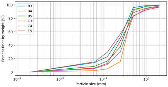 The particle size distribution and metal concentrations were obtained in laboratory tests for soil and sediment samples. The strainers used for particle size characterization had holes ranging between 2 and 0.063 mm [30]. We separated the material <0.063 mm for chemical analysis, in order to determine the concentration of metals by atomic absorption spectrometry, using the acid digestion method (HNO3—H2O2). The metal analysis included the following elements: Lead (Pb), Chromium (Cr), Copper (Cu), Manganese (Mn), Nickel (Ni), Magnesium (Mg), Zinc (Zn), Iron (Fe), Aluminum (Al) and Cadmium (Cd).