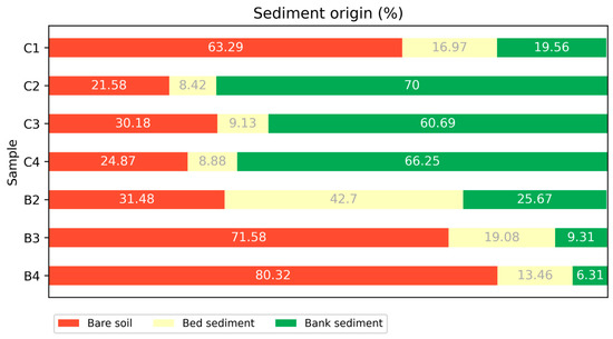 The banks have the smallest contribution in the Bandeira (B) basin, with an average of 14%. The low contribution of the bank source to the sediments is due to the vegetative protection of the margins [43,44], as there is a PPA recovery project in its springs, and most of the margins have developed trees. Another justification would be the sealing of the channel upstream of the collection point, as was also reported by Vercruysse and Grabowski [45], which reduced the sediment production from these sources.