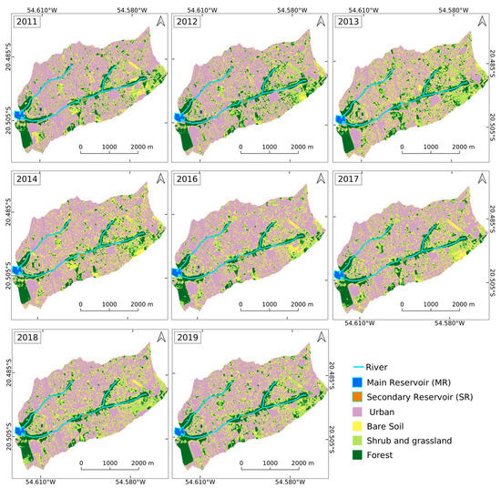 Changes in the catchments were evaluated by a temporal analysis of land use and land cover (LULC) from 2011 to 2019, using RapidEye (images courtesy of Geo Catálogo MMA, Brazil) and Sentinel-2 (images courtesy of the U.S. Geological Survey) imagery, with 5 m and 10 m of spatial resolution, respectively. The visible spectral bands (red, blue and green) were used to classify the LULC throughout the years. The LULC was carried out via the supervised classification of images, which consists of segmenting and classifying the objects and evaluating the accuracy of the classification afterwards. We used the Semi-Automatic Classification Plugin from QGIS Python Plugins Repository to classify all used satellite imagery [36]. We consider four classes of LULC: arboreal vegetation (trees and shrubs), undergrowth (grass), bare soil (soil without vegetative cover), and urbanized (impermeable areas). LULC maps were generated for each year, individually, and after classification, the respective classes were quantified.