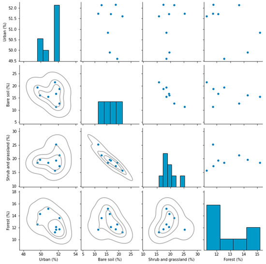 We verified the correlation between land use and land cover variables for the evaluated years (Figure 6). The analysis indicated a significant negative correlation between bare soil and undergrowth (r = −0.919 p = 0.001). The other variables showed no correlation.
