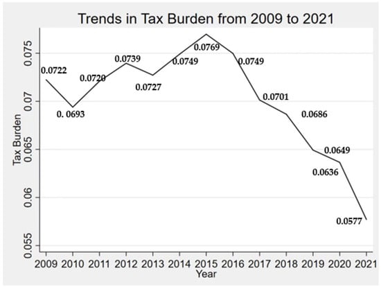 First, from the perspective of policies and systems, the tax reduction policy aims to stimulate market vitality and reduce the burden on enterprises. At present, our country is in the stage of economic growth slowing down. Corporate taxation is an important measure for the government to interfere in corporate activities. The future direction of tax reduction policy will have a very obvious impact on corporate investment. In China, the “Replacing the Business Tax with A Value-Added Tax” policy, which has achieved remarkable results, has promoted the improvement of enterprise investment efficiency by reducing the degree of financing constraints (Qian Xiaodong, 2018); the accelerated depreciation policy for fixed assets has significantly promoted the investment in fixed assets of pilot enterprises by reducing the cash flow pressure of enterprises [8]. Since 2015, with the continuous deepening of the structural reform on the supply side, the “cutting overcapacity, de-stocking, de-leveraging, reducing costs and improving weak links” has achieved remarkable results. As part of the “cost reduction”, tax reduction and fee reduction have played a direct and important role in reducing the burden on enterprises and promoting the transformation of old and new kinetic energy of enterprises (<Tax Reduction and Fee Reduction: giving enterprises a greater sense of “access”>, Economic Daily, 23 May 2017). At the beginning of 2018, the Government Work Report set a tax and fee reduction target of RMB 1.1 trillion in scale, and has since introduced a series of measures to promote the development of the real economy and support scientific and technological innovation, bringing the scale of tax and fee reduction to more than RMB 1.3 trillion for the year (Larger tax cuts necessary and feasible, State Council, 10 October 2018). The deepening of the VAT reform and the revision of the personal tax law have become a major leap forward in tax reform, with significant tax reduction effects. From Figure 1, it can be seen that the tax burden of enterprises in China began to decline significantly in 2015, and has been showing a significant downward trend since then. The decline was smaller in 2020, due to the impact of the new crown pneumonia epidemic, and reached 9.33% in 2021 afterwards. In March 2022, the Government Work Report further pointed to increase the scale of tax cuts and implement new tax cuts. The tax cuts are aimed at keeping more cash flow in enterprises, enabling companies to develop, expanding social aggregate demand and easing weak demand during the economic downturn. The tax expenditure savings provide more incentive for companies to invest, in which case they can use the tax expenditure savings to improve the under-investment caused by the shortage of funds, thus increasing investment efficiency.