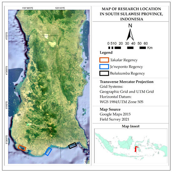 The research was carried out in intensive/super-intensive technology whiteleg shrimp brackishwater ponds in Bulukumba, Je’neponto, and Takalar Regencies, South Sulawesi Province (Figure 1), and at various central, provincial, and local government levels in Makassar City, South Sulawesi Province. Furthermore, it was conducted in institutions related to pond culture in Makassar City and related agencies at the local government level in Bulukumba, Je’neponto, and Takalar Regencies, from March to July 2021.