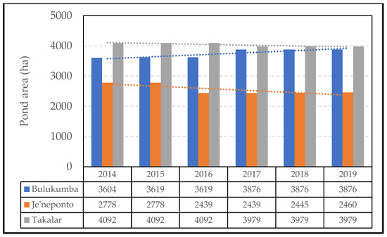 Figure 3. Pond area in Bulukumba, Je’neponto, and Takalar Regencies, South Sulawesi Province, Indonesia from 2014 to 2019 [4,26,27,28,29,30].