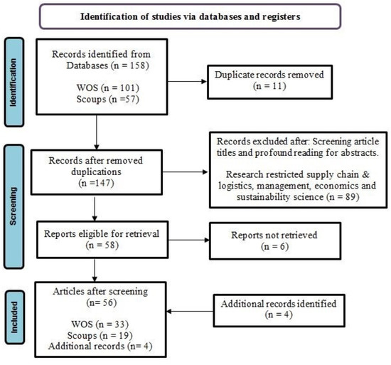 We conducted a systematic research review, where we gathered and examined the literature evaluating the topic of reverse logistics, service quality, and sustainability performance. The research was conducted using a compilation of diverse scientifically published publications that are accessible through various databases. This pertains to the methodological strategy. The study utilizes a process for review given by Tranfield [47]. The study opted to broaden the search terms to encompass all of the many theories and approaches of both reverse logistics service quality (RLSQ) and sustainable service quality (SSQ) and Figure 2 illustrates the PRISMA inclusion procedure flow [48].