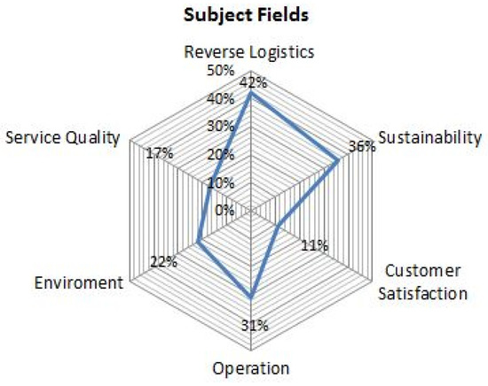 According to Figure 4, the main subject areas found in the databases showed that the main shares were related to reverse logistics (42%), sustainability (36%), and operation 31%; in addition, other areas that showed during the search were environment, service quality, and customer satisfaction, as shown in Table 1. The screening showed that reverse logistics was the most searched topic after sustainability, with a few studies that considered the quality of service and customer perception.