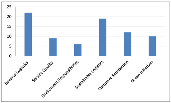 Furthermore, publications are also categorized in Figure 5 on the basis of their purpose. The main search term is “according to most of articles listed in the study”. We found that 41% of the articles had titles relevant to reverse logistics operations elements, and more than 19% of the publications addressed it. In addition, 22% of the works on sustainable logistics are tied to sustainability. Depending on the research works’ other aims, we found sustainable supply chain, environmental responsibility, and service quality in our search.