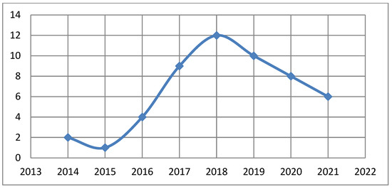 The publications are organized by publication date. Due to our date selection, all relevant publications were authored after 2011. Figure 6 displays the development for 56 papers’ total listed articles for the period 2013 to 2022. The number of citations has been steadily growing and will reach a maximum in 2020. There are citations in 75% of all documents, wherein 13% contain fewer than three citations.