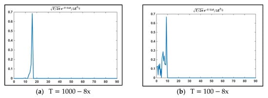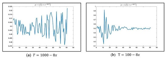 ΔE/T is a random function. According to the description of the simulated annealing algorithm process, ΔE is a random variable and T is a linear variable. To describe in line with the function variation law, this paper assumes that ΔE is a random number that follows a Gaussian distribution, and linear variable T is described by Equations (12) and (13). The MATLAB platform is used to describe the composite function, and the simulated distributions of are shown in Figure 2a,b. The results in Figure 2 indicate that the function value fluctuates substantially in the early stage of iteration, which is not conducive to the exchange of suboptimal and optimal solutions, making it difficult to achieve the purpose of expanding the search range and jumping out of the local optimum solution. In the later stage of iteration, most of the function values are distributed around 0.5. As a result, there is still a 0.5 probability of accepting the suboptimal solution based on the method, which is not conducive to the convergence of function values.