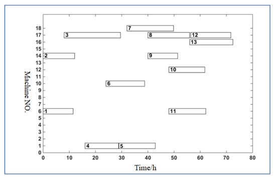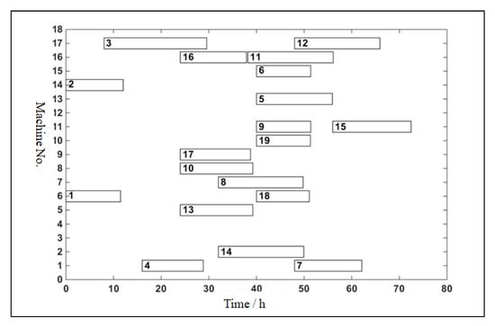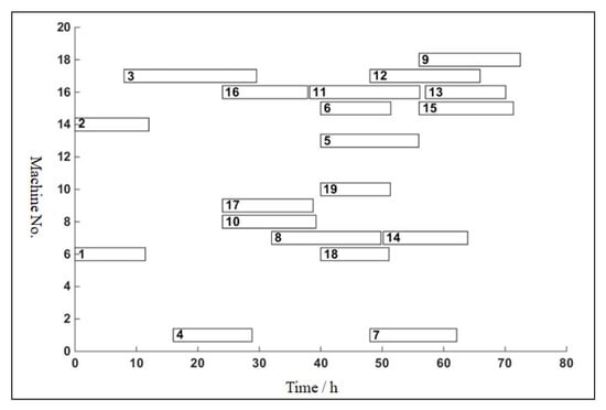 According to the description of operation scenarios in Section 5.1, new orders are added after 13 days, and the orders are re-sorted and scheduled for assignment by the method proposed in Section 4.1. Firstly, the original unoperated orders at that moment are identified. The sorting weights for the original unoperated orders and new orders are calculated according to Equation (9), and the orders are sorted in descending order. On this basis, the order scheduling strategy is arranged by GBFS, SA, and Levy-SA. The indexes related to scheduling are shown in Table 5.