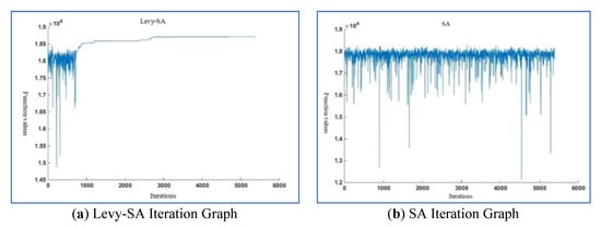 In the scheduling model solving method, SA is improved by the Levy distribution method in this paper. The Levy distribution probability function has the following characteristics: the function value is small on large probability and large on small probability. When applied in the probability function of SA for accepting suboptimal solutions, the probability of accepting suboptimal solutions is relatively high when the temperature is high, while the probability of accepting suboptimal solutions gradually decreases as the iteration increases and the temperature keeps dropping. In the scheduling results of the scheduling model, Levy-SA outperforms SA and GBFS in the total operation income, total operation time, waiting time, transfer path, and other aspects. From previous studies [,], all heuristic algorithms improved by the Levy distribution method have higher search ability in the early stage and faster convergence in the later stage of search than the original algorithm. In the search results, all heuristic algorithms improved by Levy distribution can obtain better search results.