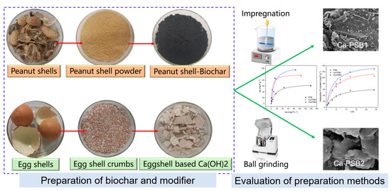 Peanut shells and eggshells are common household garbage, which is harmful to the environment. Preparation of the Ca-laden biochar using peanut shells as carbon-based material and eggshells as calcium sources is a green and cost-effective manufacturing technique. The objectives of this study are as follows: (i) Preparing the Ca-laden biochar using waste peanut shells and eggshells; (ii) Exploring the differences of the preparation of the Ca-laden biochar by the impregnation method and ball milling method; and (iii) Evaluating the P adsorption capacity performance of the prepared different biochar from wastewater.